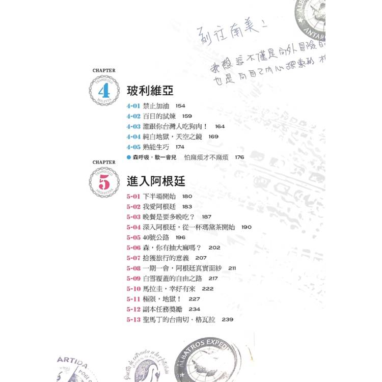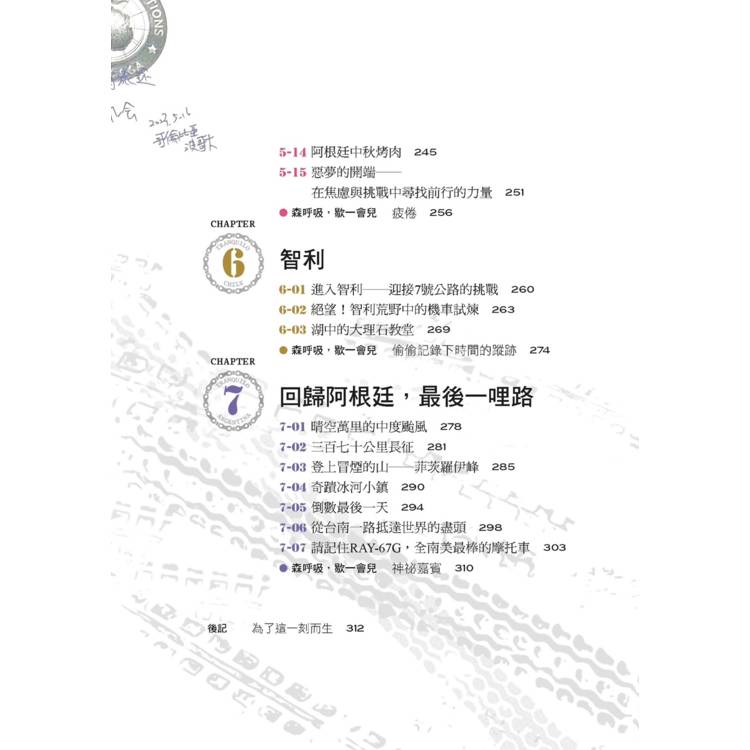 所以,如果你正翻開這本書,就請放下日復一日的規律生活,跟隨阿森的字句,去感受南美的魔幻與真實。或許你不會真的跨上摩托車,但你一定能在字裡行間感受到那股熱血與誠懇,甚至喚醒心中那份渴望已久的勇氣。