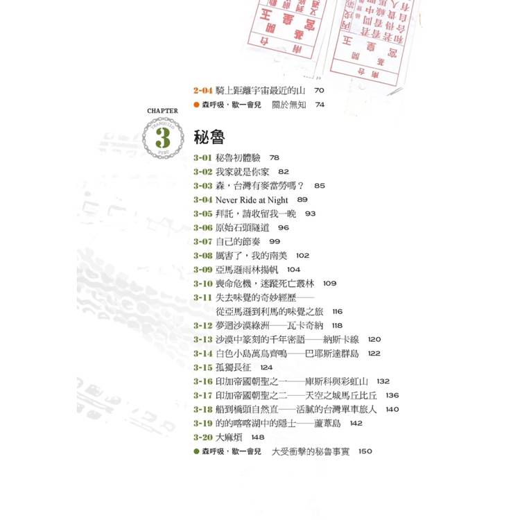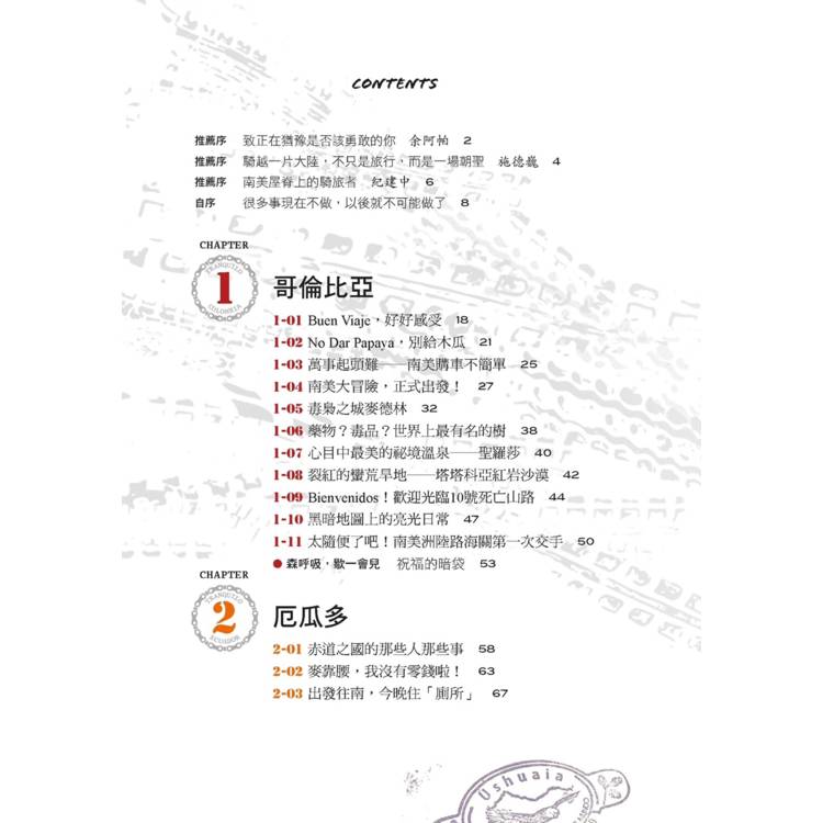 ▍瑰麗的景致與人文:從哥倫比亞一路向南,經厄瓜多、秘魯、玻利維亞、智利、阿根廷,帶領讀者飽覽亞馬遜雨林、馬丘比丘、納斯卡線、烏尤尼鹽湖、巴塔哥尼亞冰原、菲茨羅伊峰等名山勝水,不只是打卡,而是用身體與心靈感受旅途的點點滴滴。