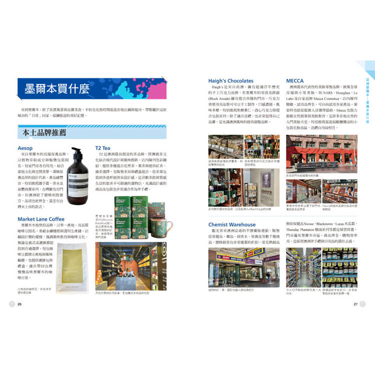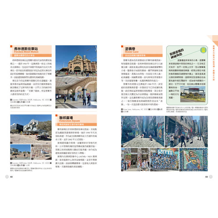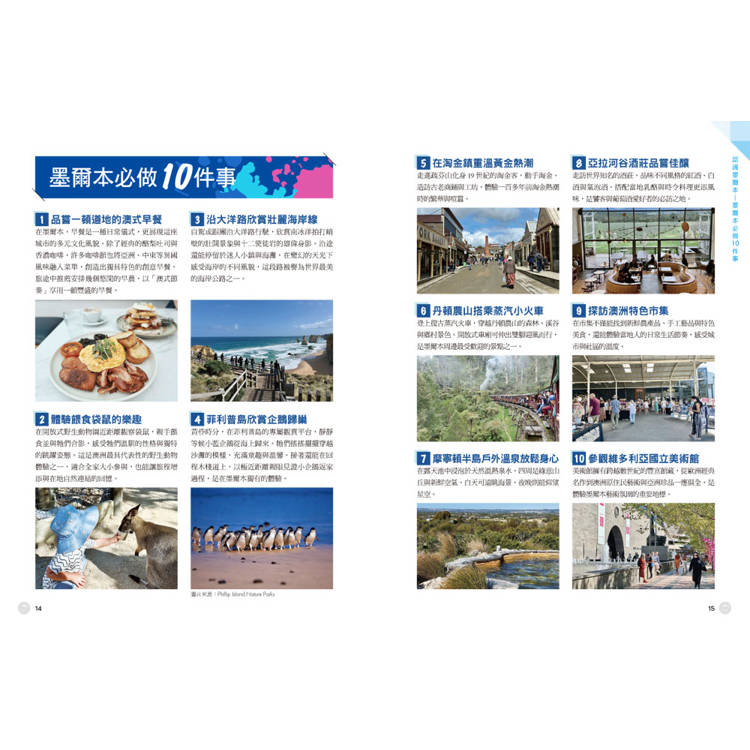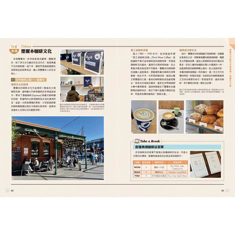 除了景點介紹,本書更深入挖掘澳洲的文化底蘊。作者以在澳洲多年求學、就業、生活,甚至移居的視角書寫,透過「深度專欄」帶你了解墨爾本最引以為傲的咖啡文化、熱血的澳網賽事、親子友善風氣,以及各種獨特的野生動物、市集文化指南,提升旅程的樂趣。