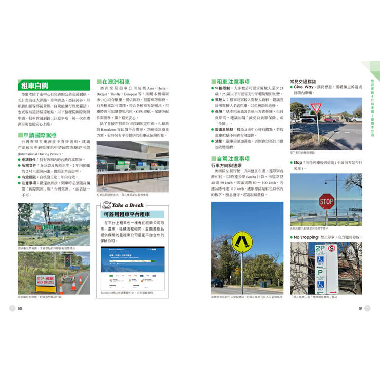澳洲與台灣駕駛方向不同,本書特別針對自駕族群整理「澳洲行車規則」與「號誌解析」,助你克服右駕恐懼,輕鬆自駕遊澳洲。此外,書中也涵蓋租車建議、myki交通卡使用、抵達墨爾本後的轉乘方法等交通資訊,無論是打算自駕,或使用大眾交通工具的旅客皆能適用。