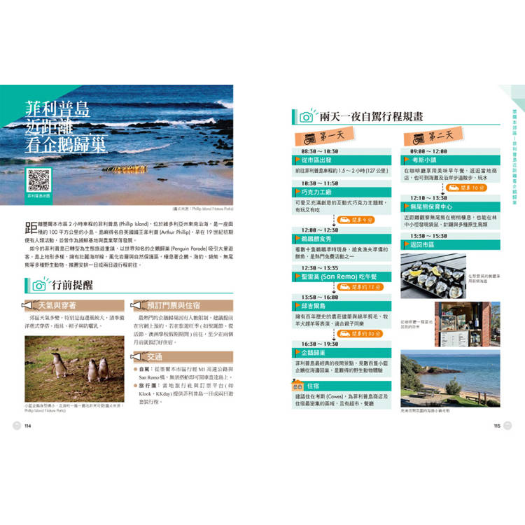 針對墨爾本郊區設計7條截然不同的主題路線。無論是想去「摩寧頓半島」泡溫泉、「丹頓農山脈」搭蒸汽小火車,還是前往「大洋路」朝聖十二使徒岩,本書皆提供詳盡地圖、自駕攻略與行程規畫,讓你從市區出發,輕鬆切換城市與自然模式。此外,搭配作者貼心的行前提醒,提供各條郊區路線的氣候與穿著建議、飲食、動物保育等相關旅遊資訊,幫助讀者提前做好準備。