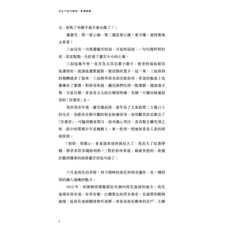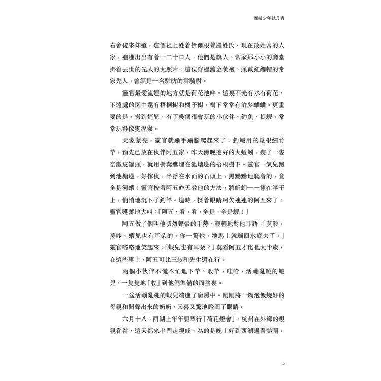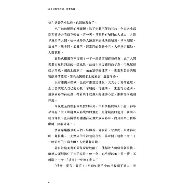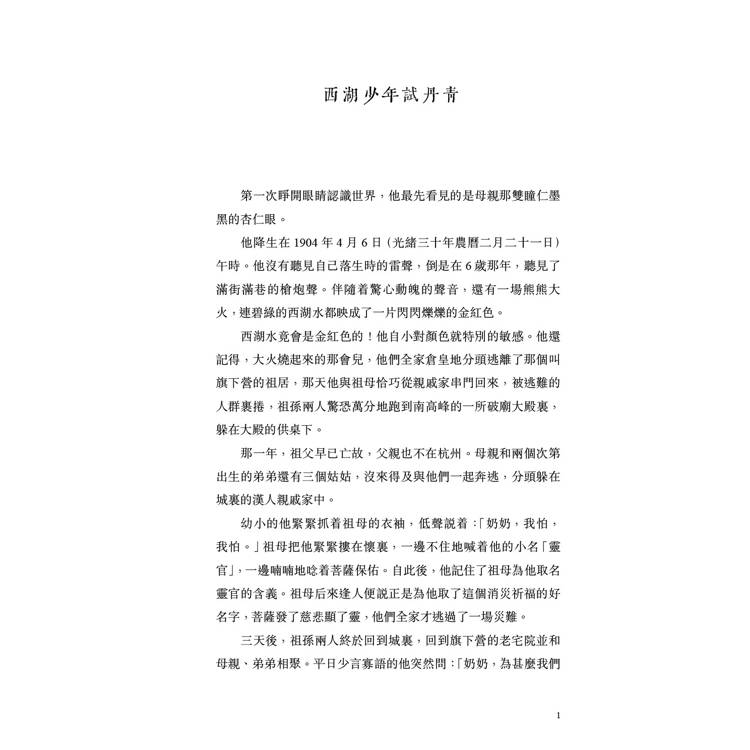 祖母把他從母親身旁牽走,高高地揚起頭,輕輕地咕噥:「旗人有甚麼打緊?杭州城裏的旗人,多了!靈官乖孫兒,你記?,你爺爺雖然吃皇糧,可沒有打過仗殺過人,我們不怕的。靈官,我們有菩薩保佑呢!」