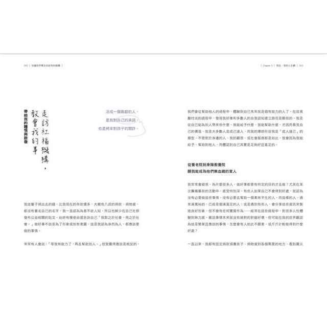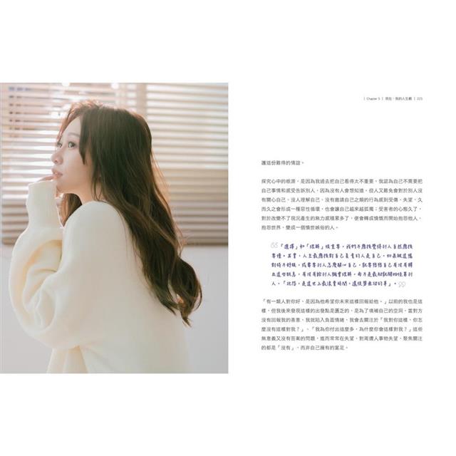 那些顛沛流離、那些黑暗又危險的經歷,雖説驚險,但也幸運,我還活著......還能活成現在這個樣子。有句話說:「沒有傘的孩子,只能努力奔跑。」我一直都努力奔跑著,但有些羈絆一直阻礙著我,在我的人生遇上一些顛簸時,這些羈絆便會使我停滯不前,我得搞清楚,它們究竟是什麼?對我來說,人生就是不斷拾起又放下的過程,而真正的成長,是要學會放下。隨著年歲漸長、經歷越多,我們不自覺會讓人生包袱越來越重,讓自己越來越難前行,但其實更重要是,如何放下那些我們不該緊握的東西,我們的人生才能越走越順暢、優雅。