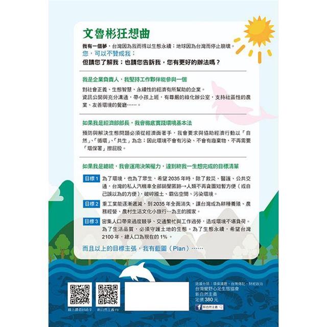 放棄美國籍、深愛台灣的阿兜仔、環保鬥士、放下年薪千萬的公益律師、抗癌成功的養生傳奇人物……,的確,這都是媒體報導過的文魯彬,而這本書更能讓您完整認識如此多面向的文魯彬,他那處於人生轉折時的所思所想、親身見證台灣環境的美麗與哀愁,以及非比尋常且源源不絕的超前想法與堅毅行動力。