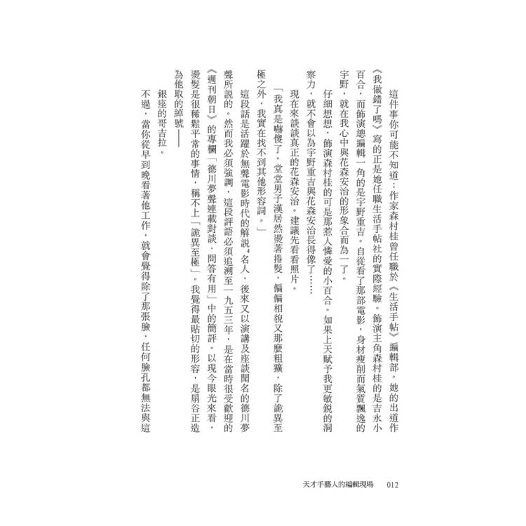他全才全能,寫稿、拍照、繪製插圖、設計版面……統率雜誌編輯的每個細節,甚至雜誌社的每日餐食,他都親自把關,拒絕任何妥協。他不只關心生活中的食衣住行,也是推理小說和落語的專家,還被同行譽為被編輯耽誤的漫才大師。只要他拿起紅筆,整間編輯室就陷入愁雲慘霧,深怕辛苦寫的稿子被改得只剩標點符號。但他改過的稿子淺顯而生動,連大文豪森茉莉都大呼佩服。