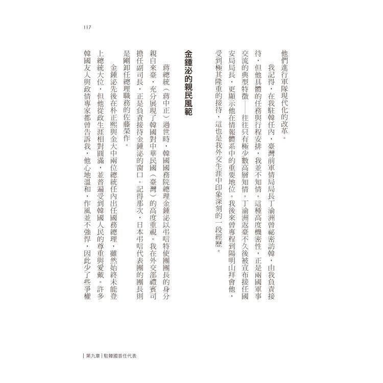 我與金鍾泌交談時多以日語為主,而最令我印象深刻的,是他在球場上的舉止。每次與他打高爾夫,他總會事先準備許多小禮物,並在場上與桿弟、工作人員閒話家常,親手送上禮物。他這種親民、細膩的作風,讓人感受到他的溫暖與誠懇。對我而言,金鍾泌是我在駐韓期間特別懷念的一位人物。