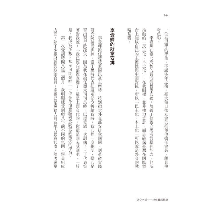 本書不僅展現臺灣如何在艱困國際局勢中創造生存空間、守護國家尊嚴,更細膩揭示外交背後的抉擇、情感與人性張力,是理解臺灣外交發展不可或缺的重要見證。
