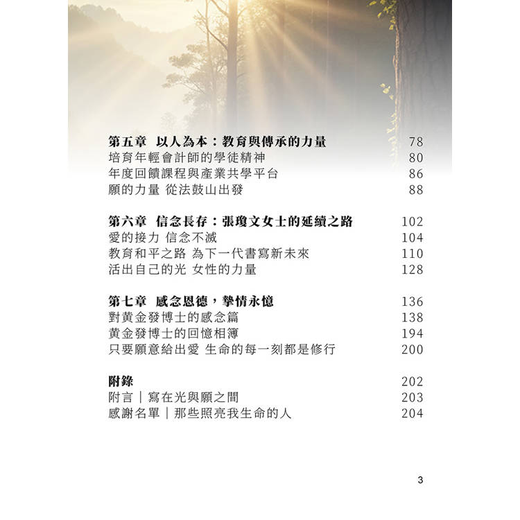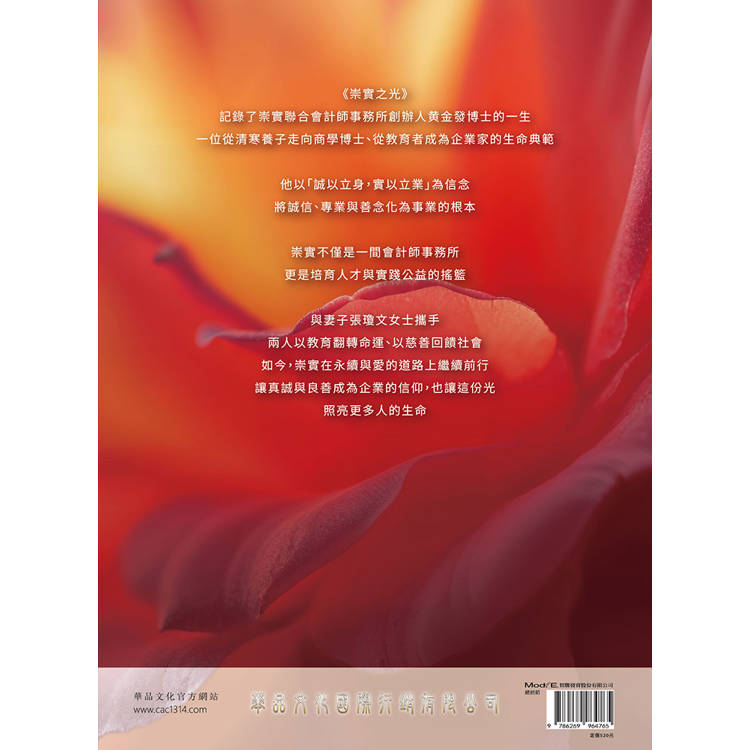 《崇實之光》記錄了崇實聯合會計師事務所創辦人黃金發博士的一生,一位從清寒養子走向商學博士、從教育者成為企業家的生命典範。他以「誠以立身,實以立業」為信念,將誠信、專業與善念化為事業的根本。崇實不僅是一間會計師事務所,更是培育人才與實踐公益的搖籃。與妻子張瓊文女士攜手,兩人以教育翻轉命運、以慈善回饋社會。如今,崇實在永續與愛的道路上繼續前行,讓真誠與良善成為企業的信仰,也讓這份光,照亮更多人的生命。