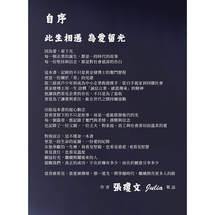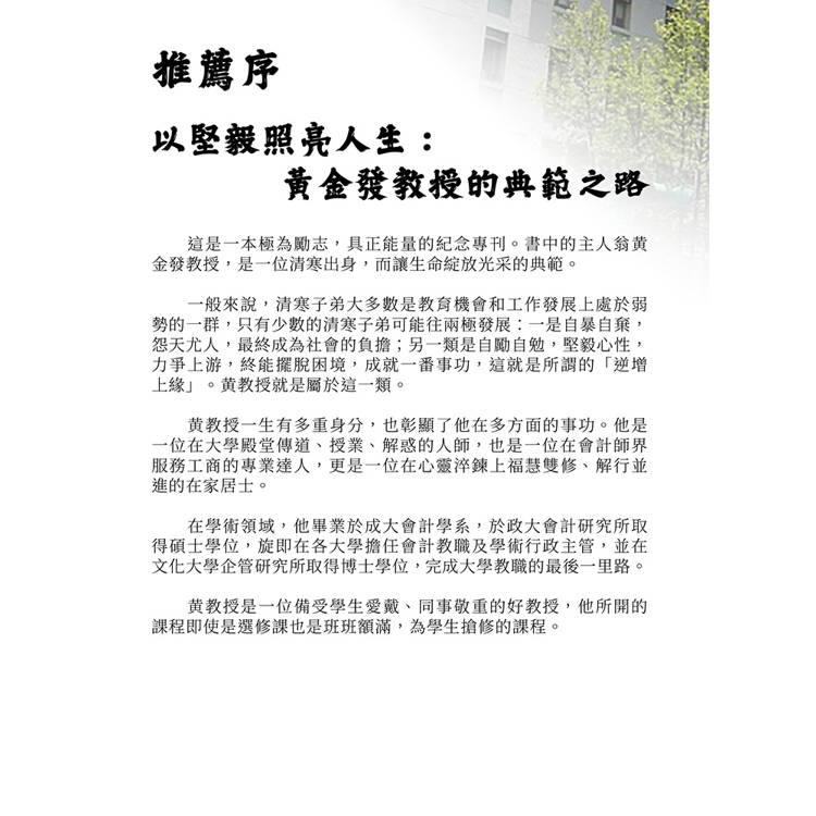 這是一本極為勵志,具正能量的紀念專刊。書中的主人翁黄金發教授,是一位清寒出身,而讓生命綻放光采的典範。