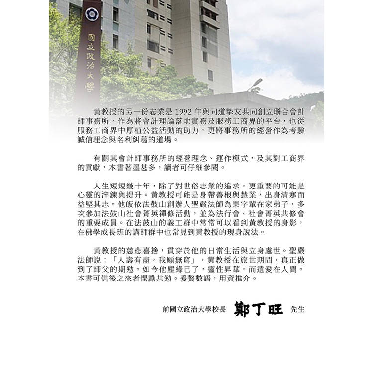 黄教授的慈悲喜捨,貫穿於他的日常生活與立身處世。聖嚴法師說:「人壽有盡,我願無窮」,黄教授在旅世期間,真正做到了師父的期勉。如今他塵緣已了,靈性昇華,而遺愛在人間。本書可供後之來者惕勵共勉。爰贅數語,用資推介。