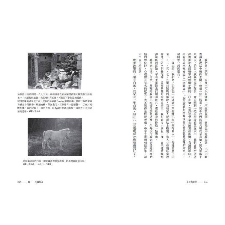 戰爭改變的,還有白馬。我家有一隻白馬,但在八二三炮戰時被炮彈傷到肚子,痛苦哀鳴,爸爸只好委託鄰居結束牠的生命,然後和鄰居分食。我家還有一隻白沙驢,被阿兵哥(國民黨軍隊)牽走(說好聽是徵召)載彈藥。於是,白馬和驢子成了家裡的傳說。