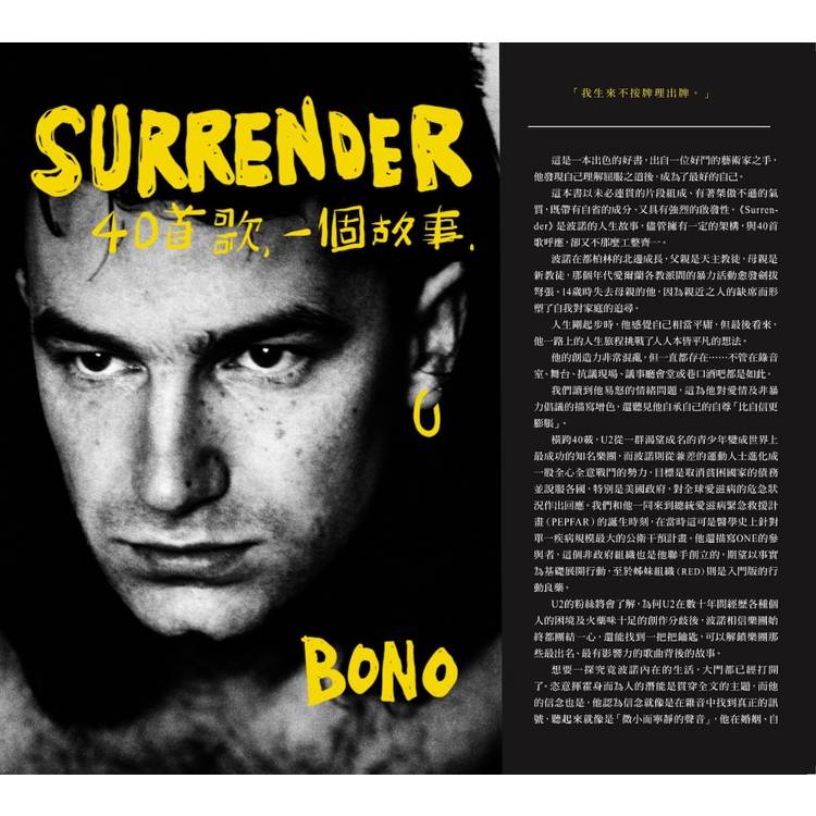 這本書以未必連貫的片段組成、有著桀傲不遜的氣質,既帶有自省的成分、又具有強烈的啟發性。《Surrender》是波諾的人生故事,儘管擁有一定的架構,與40首歌呼應,卻又不那麼工整齊一。