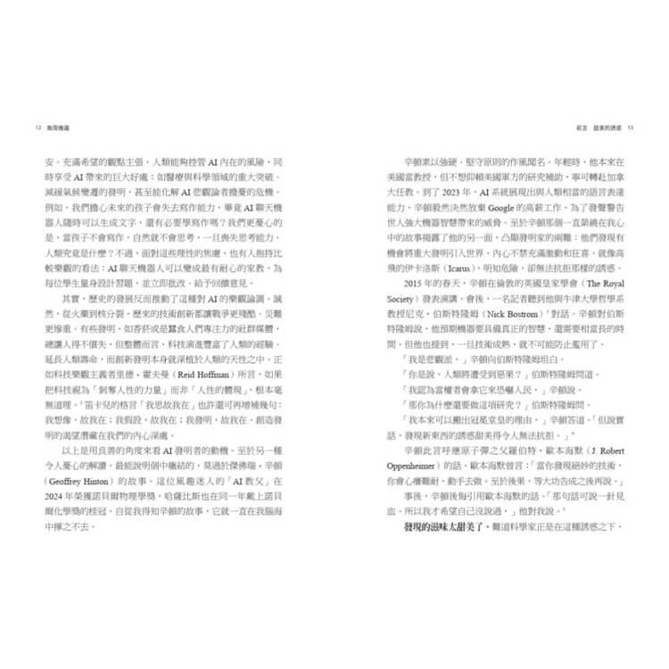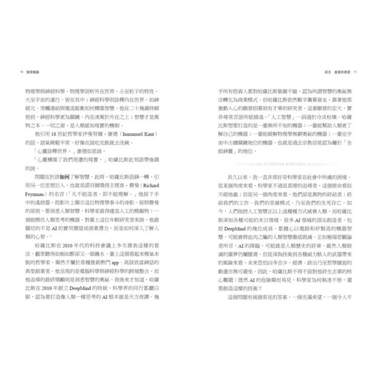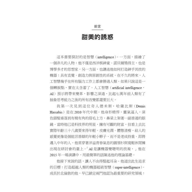 這本書要探討的是智慧(intelligence)。一方面,描繪了一個非凡的人物:他不僅是西洋棋神童、諾貝爾獎得主,也是博學多才的思想家。另一方面,也講述他如何打造神乎其技的機器:具有直覺、創造力與原創性的系統。在不久的將來,人工智慧幾乎在所有腦力工作上都會勝過人類。如果只說這是一個轉捩點,實在太含蓄了。人工智慧(artificial intelligence,AI)預示將帶來變革,影響之深遠,比起七萬年前人類有了抽象思考能力之後的所有改變都還要巨大。