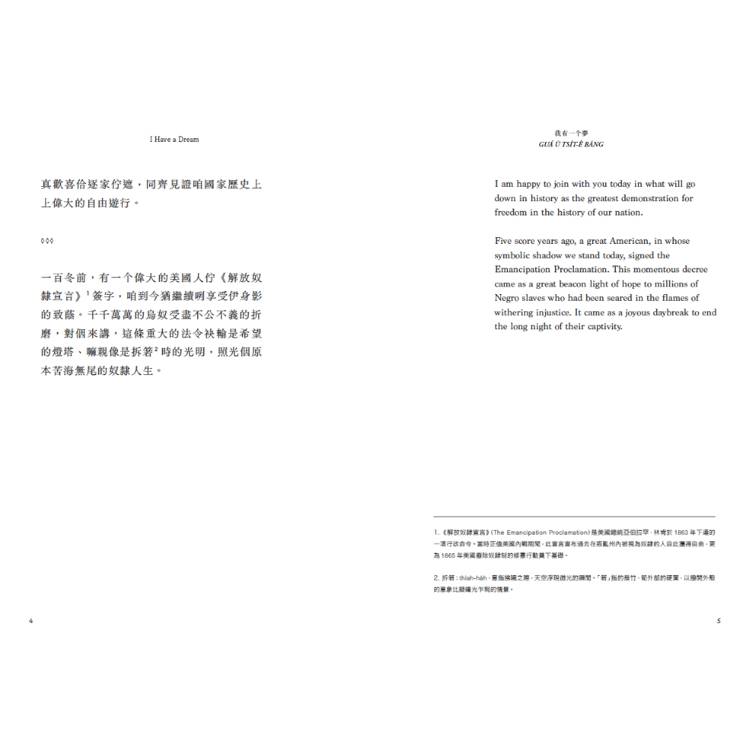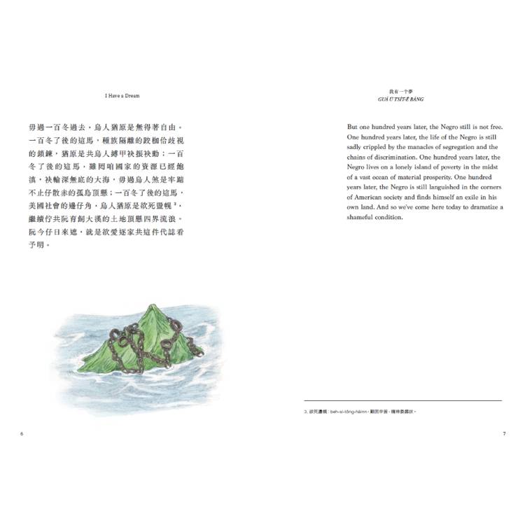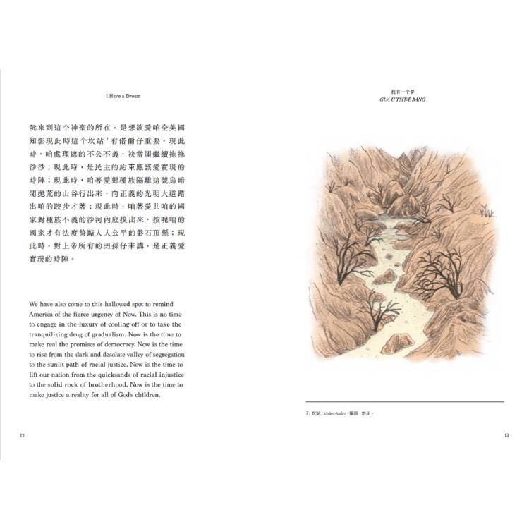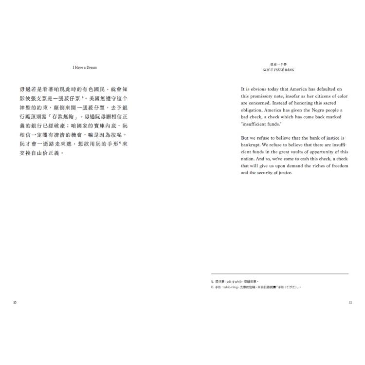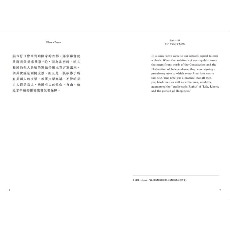 「我有一個夢!」這句名言出自美國民權運動領袖馬丁.路德.金恩博士的著名演說,日後成為全球追求自由、平等與公義的永恆象徵。本書首次將這份經典演說,以台文完整翻譯,並附上英文原文,及華文譯文作為對照。