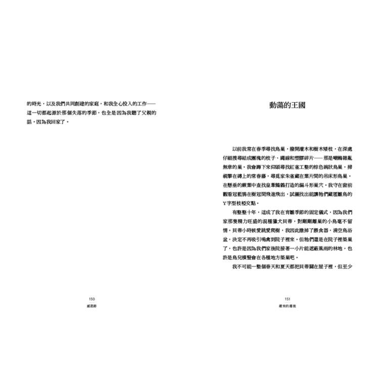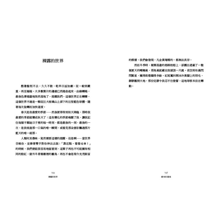 ◆文辭詩意,篇幅精煉,以短篇隨筆帶出動人哲思,從鳥類花草的日常變化,到無常與再生的循環,展現人類與自然連結的共感與關懷。