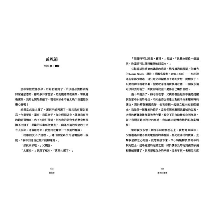 父親說這話時毫無諷刺的意思,他沒讀過湯瑪斯・伍爾夫(Thomas Wolfe,譯注:美國小說家,1900-1938),也許連這名字都沒聽過。這只是父母關愛孩子時的安慰,提醒孩子,只要他和母親還活著,世間就永遠有我棲身之處,一個我永遠可以回去的地方,即使有時我並不覺得自己屬於那裡。