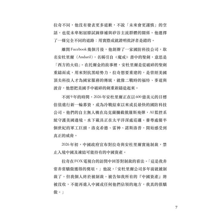 在此背景下,帕爾默.拉奇與他創辦的安杜里爾,已成為當代國防領域中最舉足輕重、也最令人意想不到的力量之一。這本書,講述的正是安杜里爾如何引領美國武器系統開發方式的根本變革。