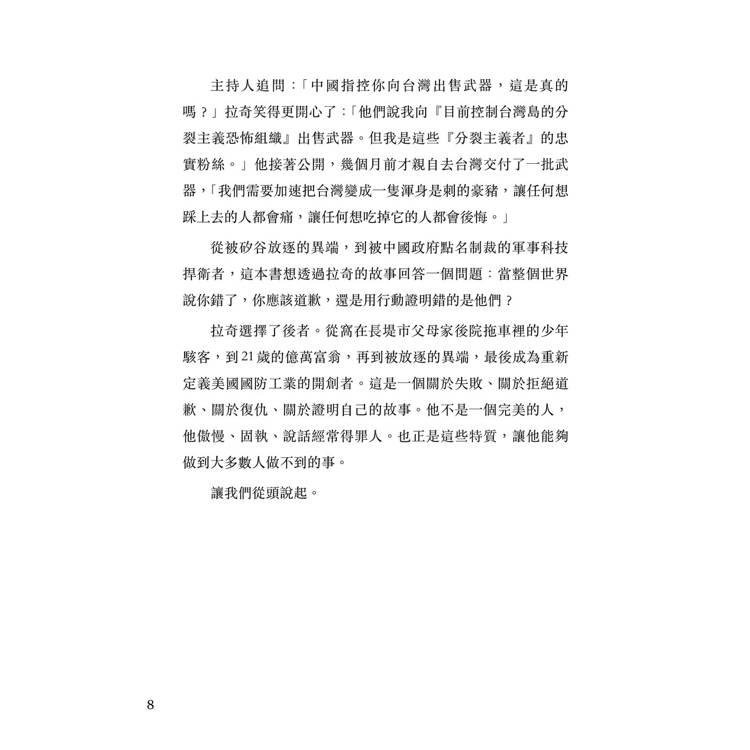 拉奇從未立志成為國防業巨頭。他只是不願接受戰爭的未來必然是遲緩、昂貴而落於人後的。蕭上農精準捕捉了拉奇身上那股不肯妥協的火焰。在我看來,這本書應該擺在台灣與美國每一位決策者的案頭。