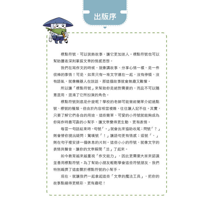 如今教育越來越重視「作文能力」,因此更需要大家來認識並善用標點符號。為了幫助小朋友輕鬆學會這些符號朋友,我們特別編撰了這套關於標點符號的小幫手。