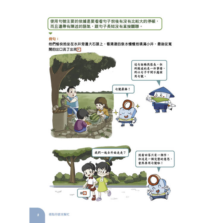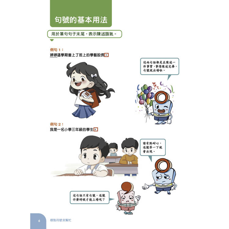 ● 趣味漫畫,快樂學習:採用可愛童真的漫畫和憨態可掬的「橡皮人」,讓孩子在逗趣、活潑的漫畫情境中學習標點符號相關知識。將標點符號擬人化,成為「文章得力助手」,讓學習過程不再枯燥無味,反而覺得趣味盎然。