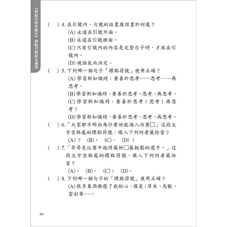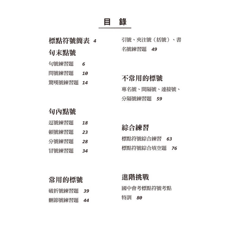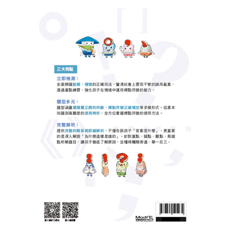 ● 立即檢測:全面辨識點號、標號的正確用法,釐清社會上習而不察的誤用亂象,透過重點練習,強化孩子在情境中運用標點符號的能力。