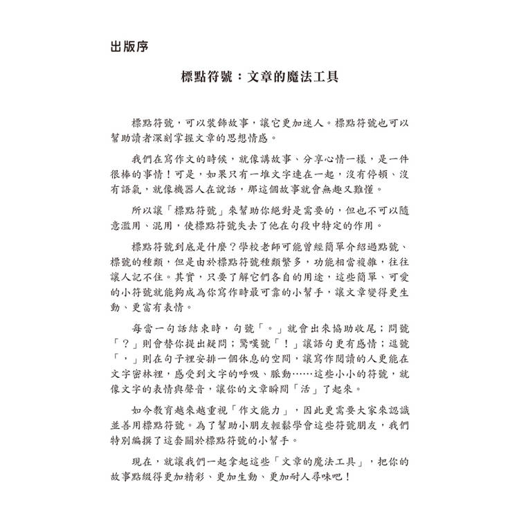 如今教育越來越重視「作文能力」,因此更需要大家來認識並善用標點符號。為了幫助小朋友輕鬆學會這些符號朋友,我們特別編撰了這套關於標點符號的小幫手。