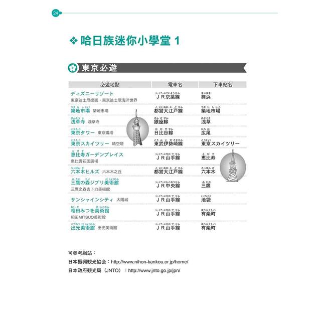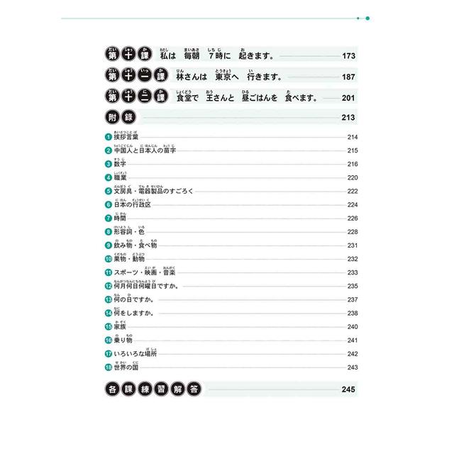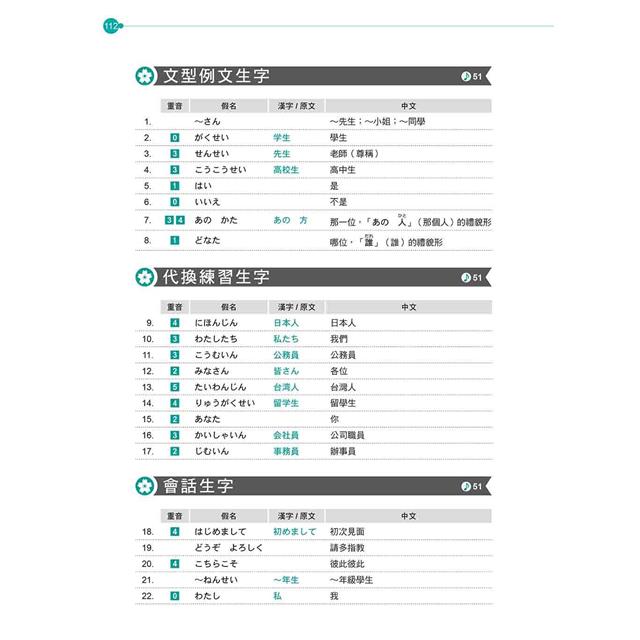 除了課文的生字之外,本書另外整理十八大類地點、景點、生活常用單字,分類清楚好記,初學日語就能逐步累積單字量。