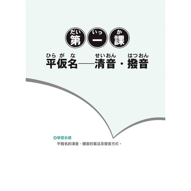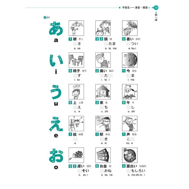 從日語的基礎平假名、片假名開始,帶你依序學習清音、撥音、濁音、半濁音、促音、拗音、長音。每個音皆搭配單字一起學習,讓你一邊認字,一邊學發音,一邊記憶單字,再加上羅馬拼音輔助發音,日語五十音立刻就能朗朗上口!