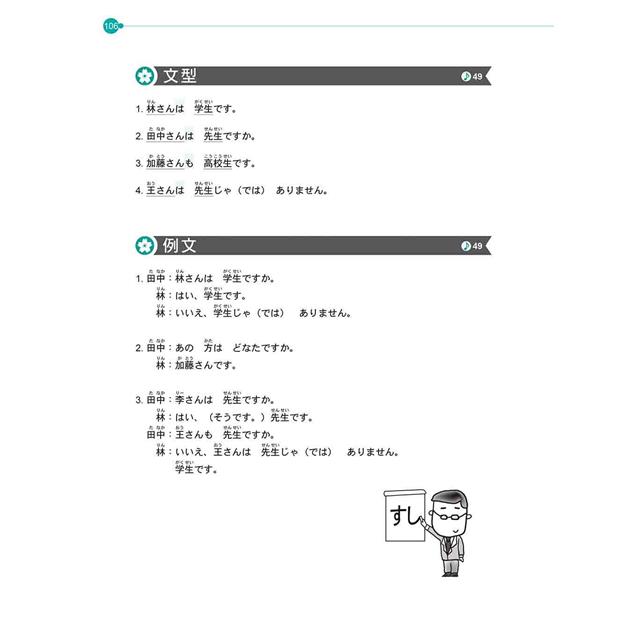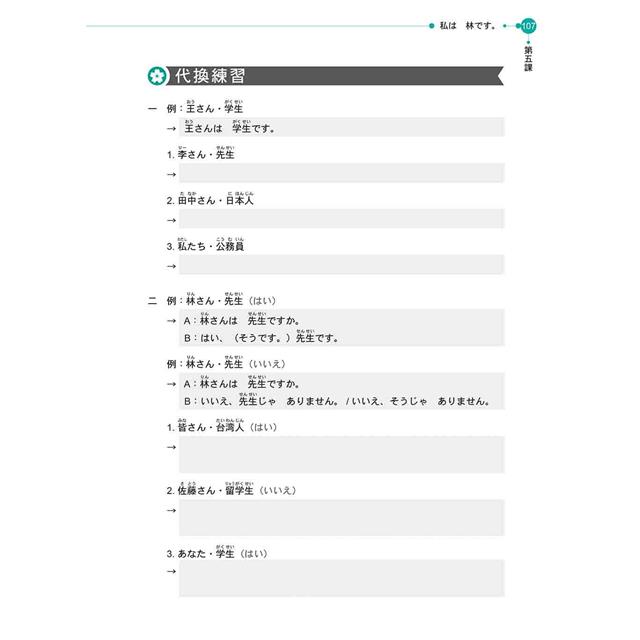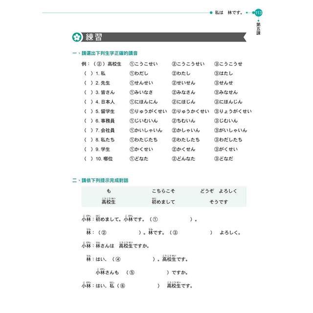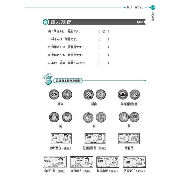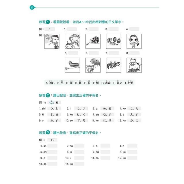 「看圖說說看」、「讀出發音,並寫出正確的平 / 片假名」、「聽聽看,看圖找出音檔所唸的單字」、「聽力練習」,這些練習題隨時穿插在課文中,聽說讀寫一併練習,讓你不會顧此失彼。