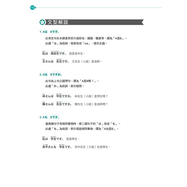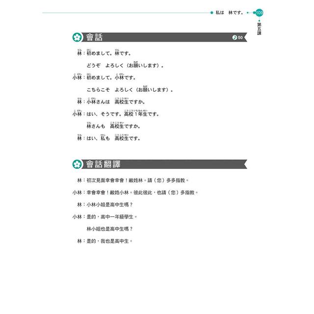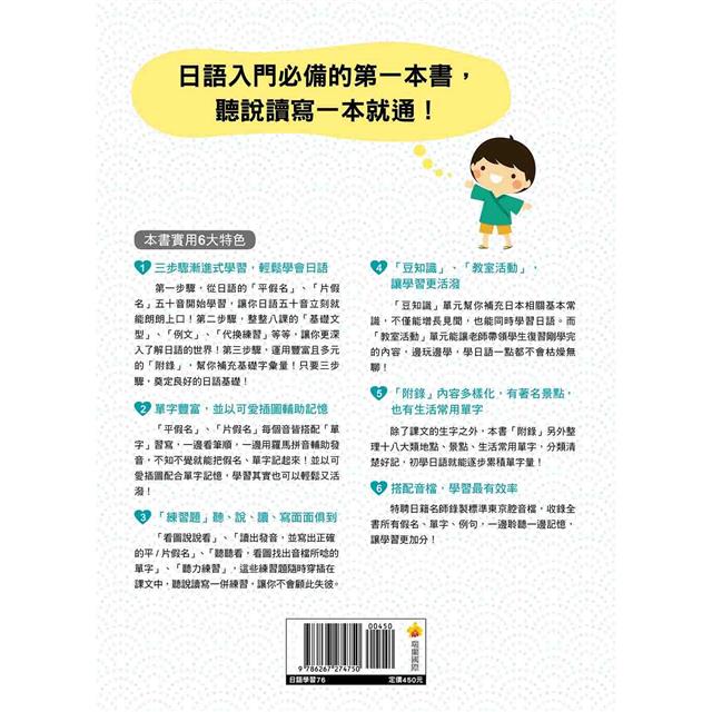 學完五十音之後,整整八課的基礎文型、例文、代換練習、實用會話、文型解說、生字,讓你更深入了解日語的世界。而最生活、最實用的例句,讓你馬上學,馬上就能運用。還有每課的練習、聽力練習、教室活動,複習加上實際運用,保證加深學習記憶!