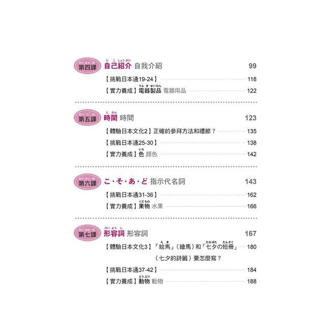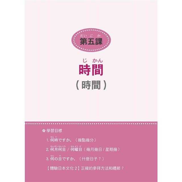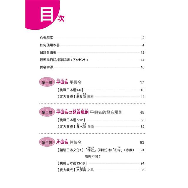 本書第一課到第三課,為學習平假名和片假名的「清音」、「濁音」、「半濁音」、「拗音」、「長音」、「促音」等等,是學習日語的第一步!除了有完整的「筆順教學」、扎實的「假名習寫」、輔助記憶的「相關單字」、跟著一起唸的「音檔教學」之外,還有聽聽看、寫寫看等等有趣的「練習活動」,讓你輕輕鬆鬆,不知不覺便學會日語50音!
