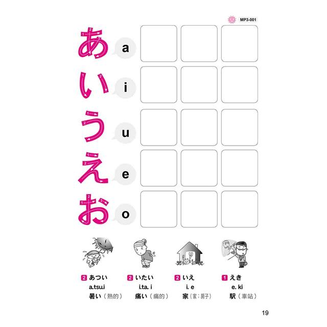 本書從最基礎的「日語假名」開始學起,一邊看筆順,一邊用羅馬拼音輔助發音,並以可愛插圖配合生活化單字記憶,不知不覺就能把假名、單字記起來。