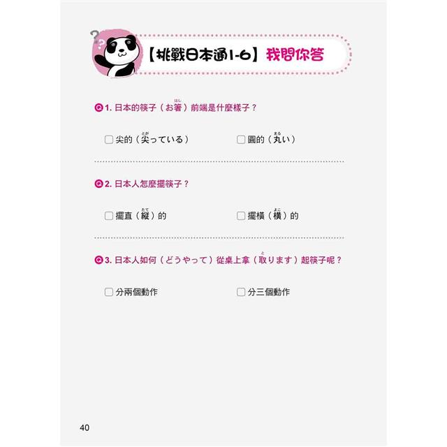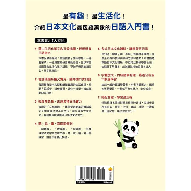 本書最大的期望是讓學習者可以把學習日語轉變成為有趣、好玩的過程。因此編排內容實用的生活單字、實際情境對話練習,更加上了大量有趣的日本文化介紹,讓學習者可以透過「日本文化體驗」了解日本人的食、衣、住、行生活面面觀,同時還可以立即現學現用動手試做看看,藉此讓學習趣味倍增,提升學習效果。