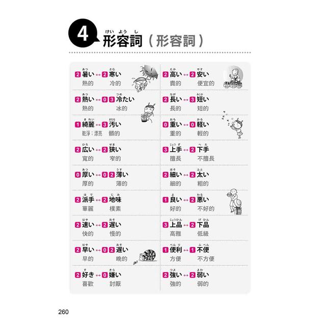 在學習日語必學基礎句型的同時,本書還加上多元化與日本文化相關的知識「體驗日本文化」、「挑戰日本通」,包羅萬象的各種日本文化知識不但可以轉換學習心情,也能更了解日本。另外還有附錄豐富實用的單字,範圍廣泛,涵蓋「數字」、「飲料」、「食物」、「文具」、「電器用品」、「時間」等十六大類,記憶必學單字之外,也能代入課文中的句型練習,學一個句子,就能學會各種說法,增強日語基礎實力。