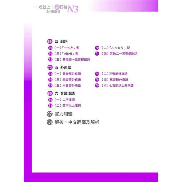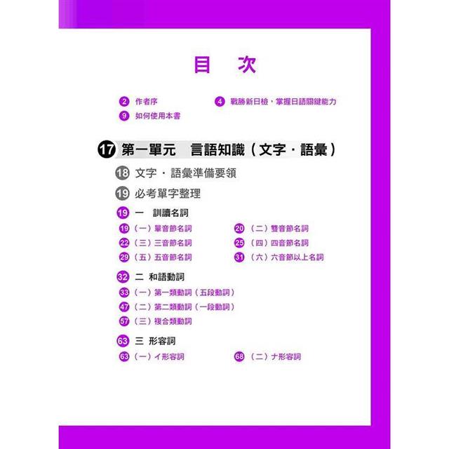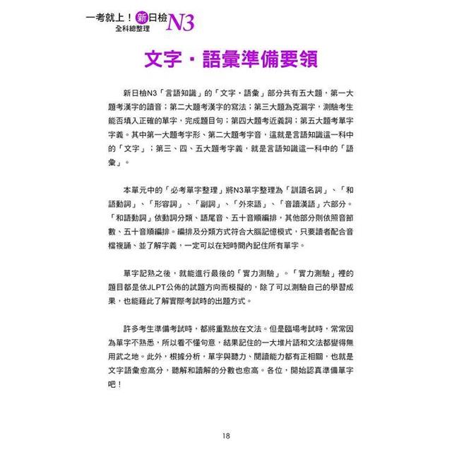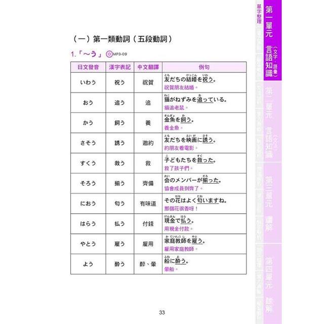 本單元中的「必考單字整理」將N3單字整理為「訓讀名詞」、「和語動詞」、「形容詞」、「副詞」、「外來語」、「音讀漢語」六部分。「和語動詞」依動詞分類、語尾音、五十音順編排,其他部分則依照音節數、五十音順編排。編排及分類方式符合大腦記憶模式,只要讀者配合音檔複誦、並了解字義,一定可以在短時間內記住所有單字。