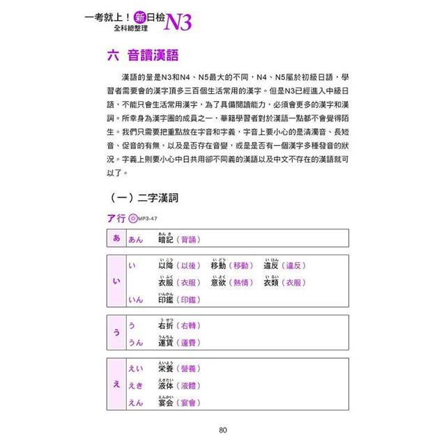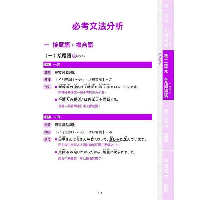 本單元挑選出N3必考的近八十個句型,並分類為「接尾語・複合語」、「副助詞」、「複合助詞」、「接續用法」、「句尾用法」、「形式名詞」等六大類。每個句型皆附有中文意思、規則以及二例句,讓您融會貫通,文法清楚不混淆!