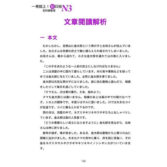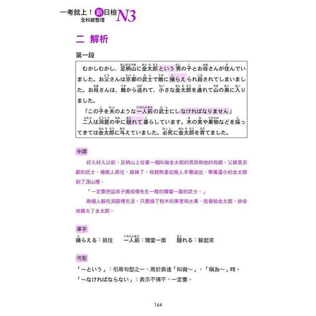 本單元老師以一長篇日文分段解析,每段皆含中文翻譯,還標示了精進閱讀能力不可或缺的材料──重點單字及句型。只要搭配第一單元學習到的文字語彙,以及第二單元學習到的句型文法,再運用本單元老師教導的拆解文章句子的方式,那麼因應N3讀解,可說是輕而易舉。