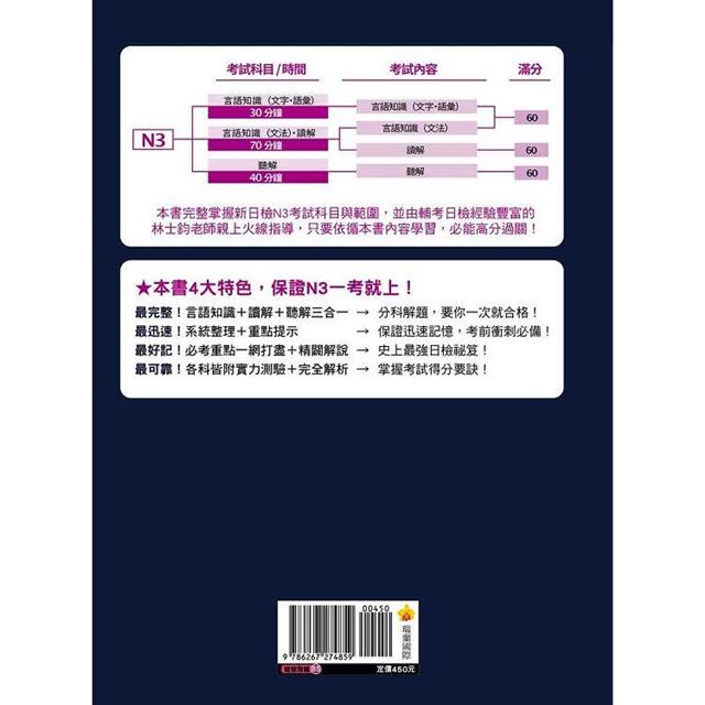 ★本書三合一,囊括N3考試科目「言語知識(文字.語彙)」、「言語知識(文法).讀解」、「聽解」,是通過日檢考試最完整的參考書!