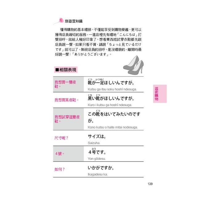 能確實地表達自己的意思,讓旅行更饒富趣味的, 首在語言。如何在旅行中針對不同場合,做最明確簡單的表達呢?本書有鑑於此,乃精選旅行中各種場合所需的會話,並以實用為要,配合實際狀況,收集最簡單、最明瞭、最生動的句子。每句日文都有羅馬拼音對照,方便您和日本人對話,如果還是說不出口時,用手比,也能暢遊日本,我們深信,有此一書在手,您會玩得更稱心、走得更自在。