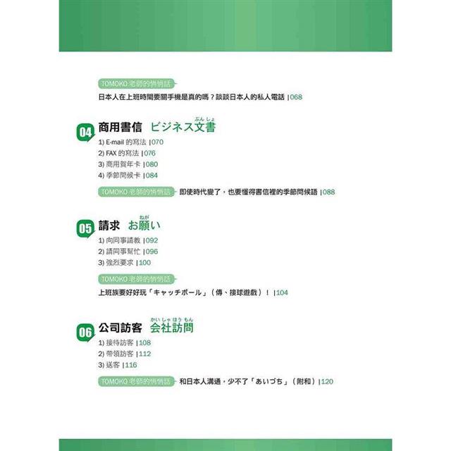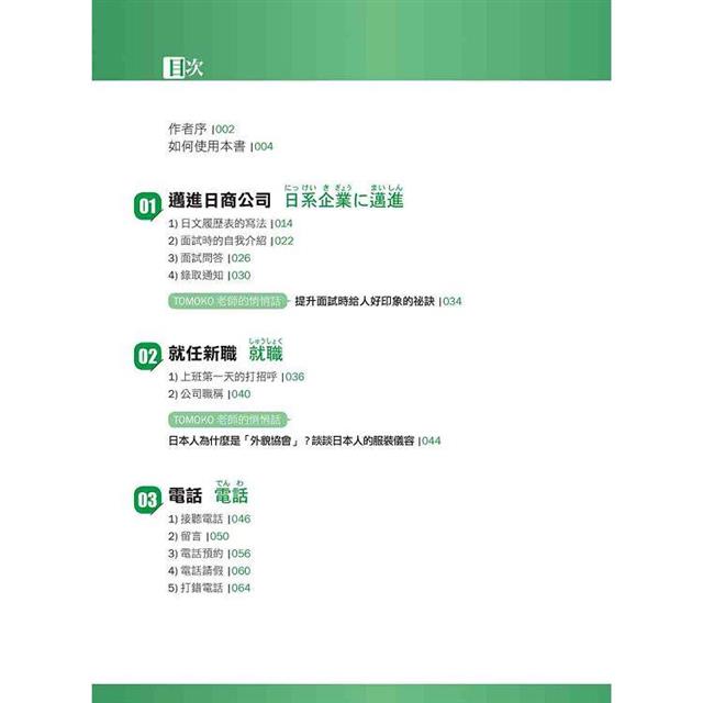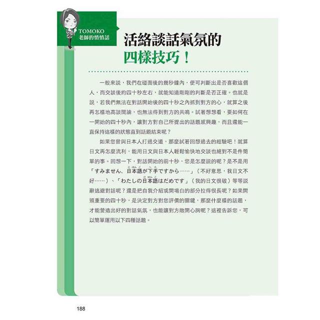 因此,本書收集了可信心滿滿地與日本人工作、可成為「利器」的日語。全書排除了教材裡常有的不自然的日語,也就是只保留了在工作現場上能派上用場的實用日語。另外,就連商場上不可或缺的敬語,也能不費吹灰之力地自然說出。再加上每個單元還設有「TOMOKO老師的悄悄話」專欄,以輕鬆好閱讀的小專欄方式,整理出本文內容沒有談到的禮儀、或是職場上的成功之道,以及若能事先知道就有好處的資訊等等。