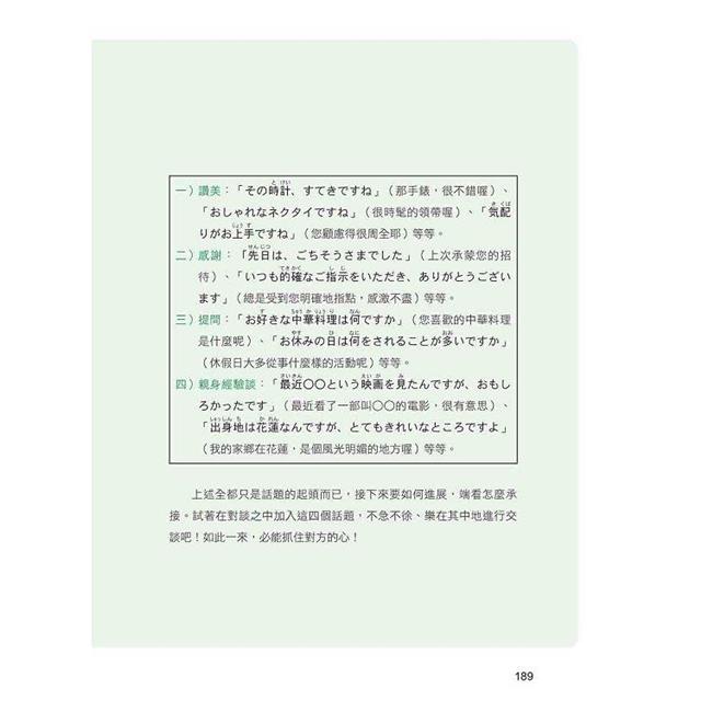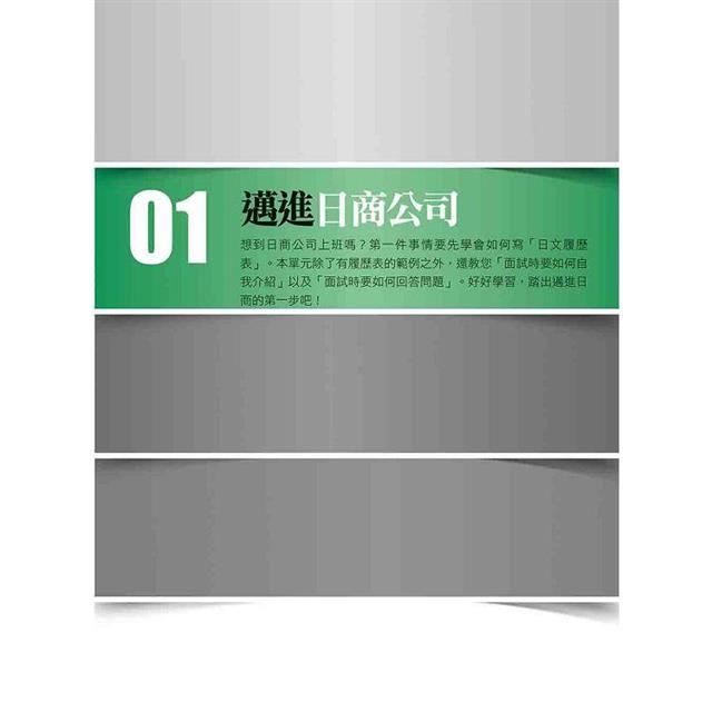 就算不是日文本科系出身的讀者也不用擔心!情境對話和一定要會的一句話」皆輔以羅馬拼音,就算對50音還不熟,您也能立刻就能跟著唸出職場上需要的商用日語!