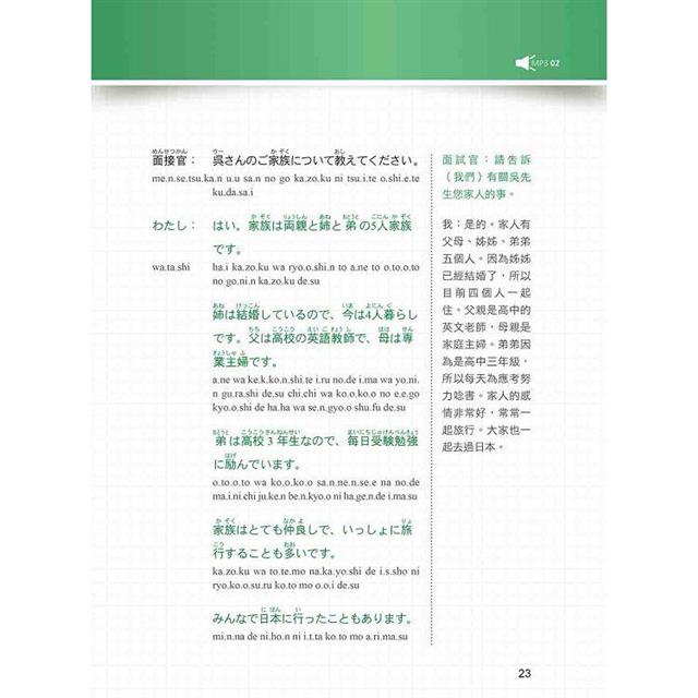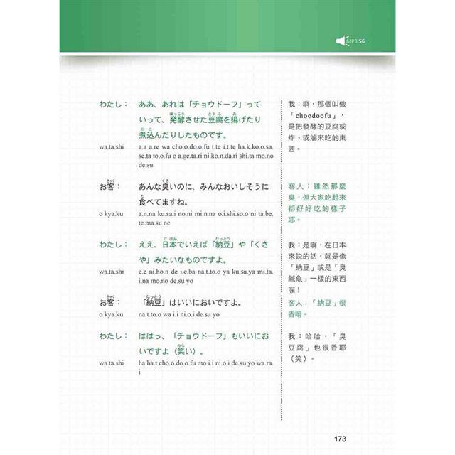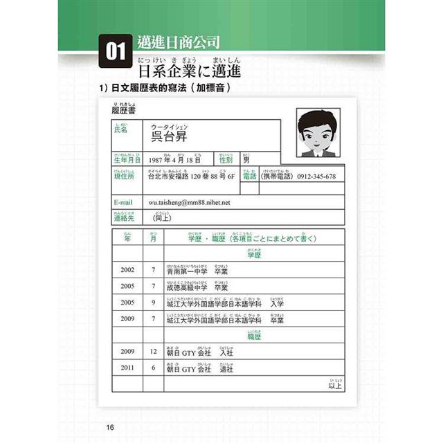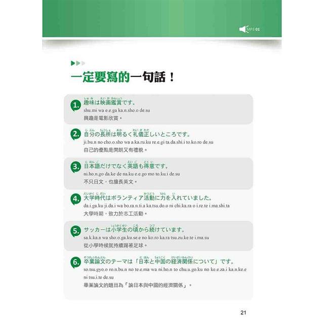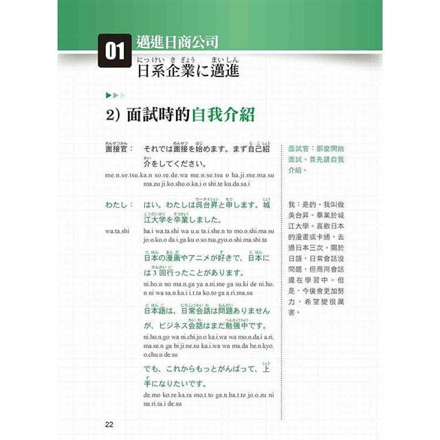 除了履歷表和商用書信外,每段情境對話、每句實用句子皆附上羅馬拼音對照,就算對50音還不夠熟悉,只要看著羅馬拼音跟著唸,你也可以說出最完整的商用日語!