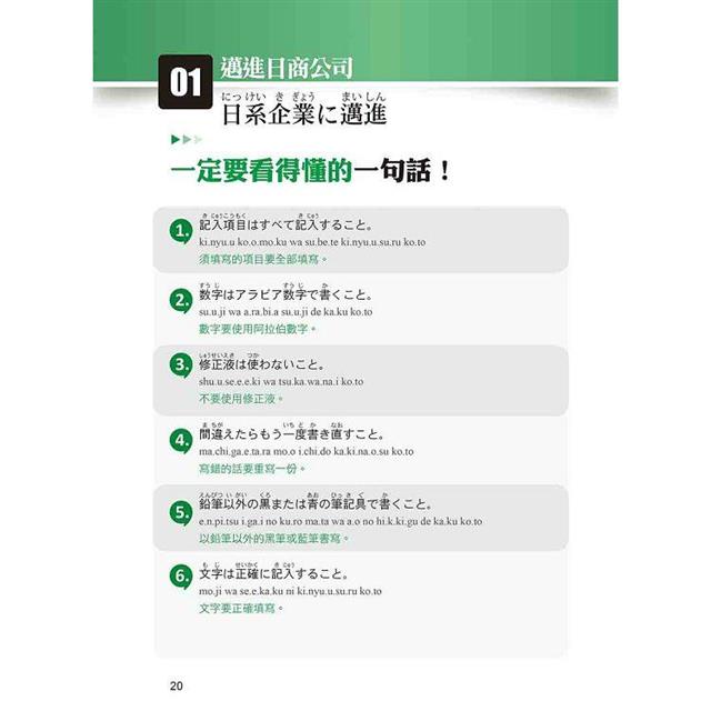 每個小單元都有「一定要聽得懂的一句話」、「一定要說的一句話」或是「一定要看得懂的一句話」、「一定要寫的一句話」,只要跟著唸、照著抄,輕輕鬆鬆就能學會最實用、最正確的商用日語!