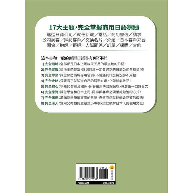 本書精選17種在職場上一定會遇到的情況,包含「面試」、「接聽電話」、「商用書信」、「請求同事幫忙」、「接待客人」、「拜訪客戶」、「交換名片」等等,只要扎實學會本書所列的各種情況下必須用到的日語,你不僅會變成商用日語達人,還能在職場上無往不利!
