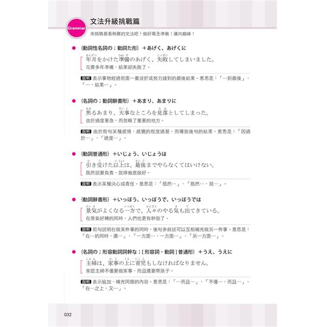 ★「文法升級挑戰」+「口語文法小祕方」延伸備齊進階用法,完勝日檢、超越顛峰!
