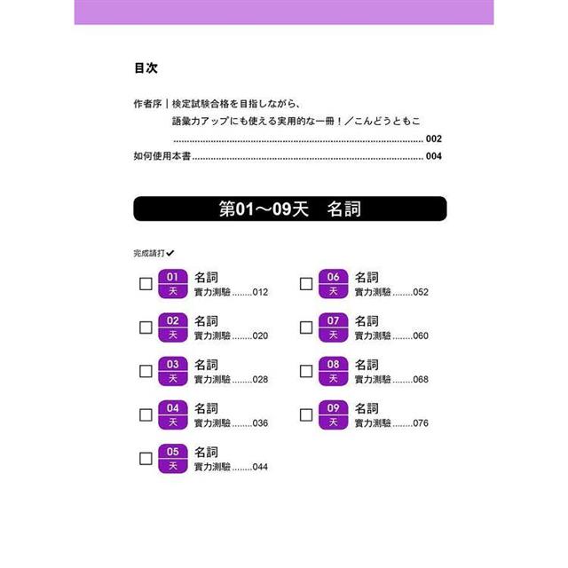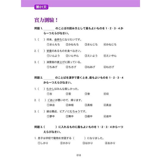 全書40天,每天背誦24個單字後的「實力測驗」,可以馬上檢視學習情況!出題形式有「選出正確的讀音」、「選出正確的漢字」、「選出正確的單字」、「選出單字用法正確的句子」四種,皆是實際考試會出現的題型,讓您應試時不慌不忙!全書超過470題的擬真試題,是您的致勝關鍵!