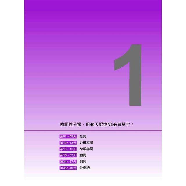 日語檢定官方規定,N3必須具備的漢字量是600個,語彙量是3000個。本書規劃讓讀者運用40天,一口氣搞定N3必考單字。