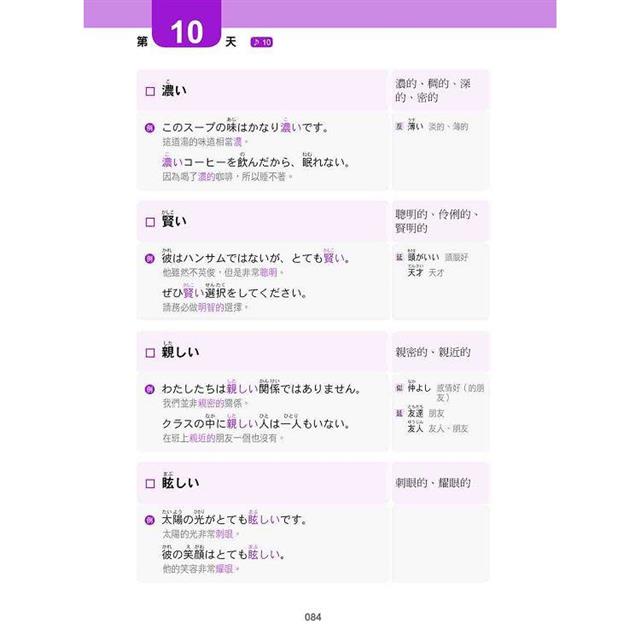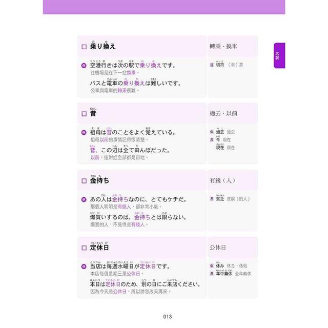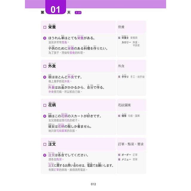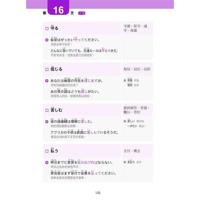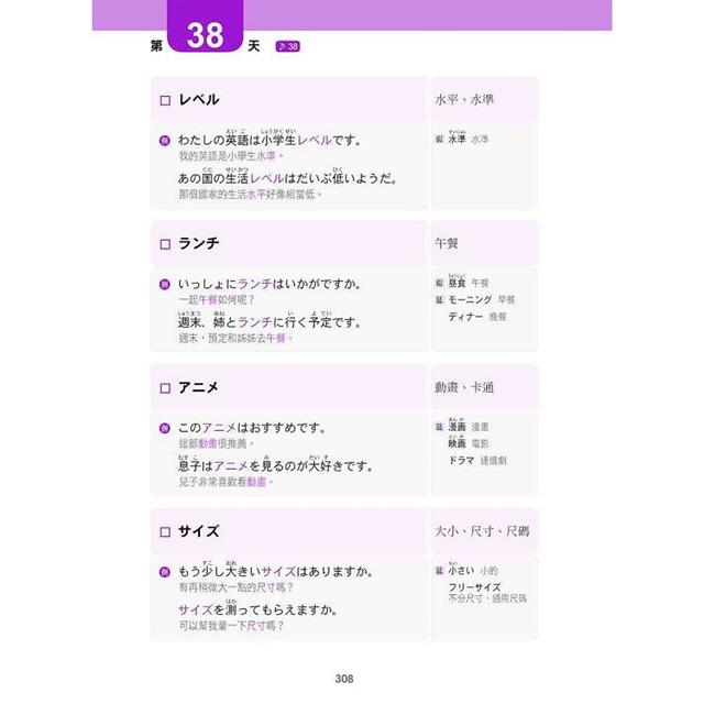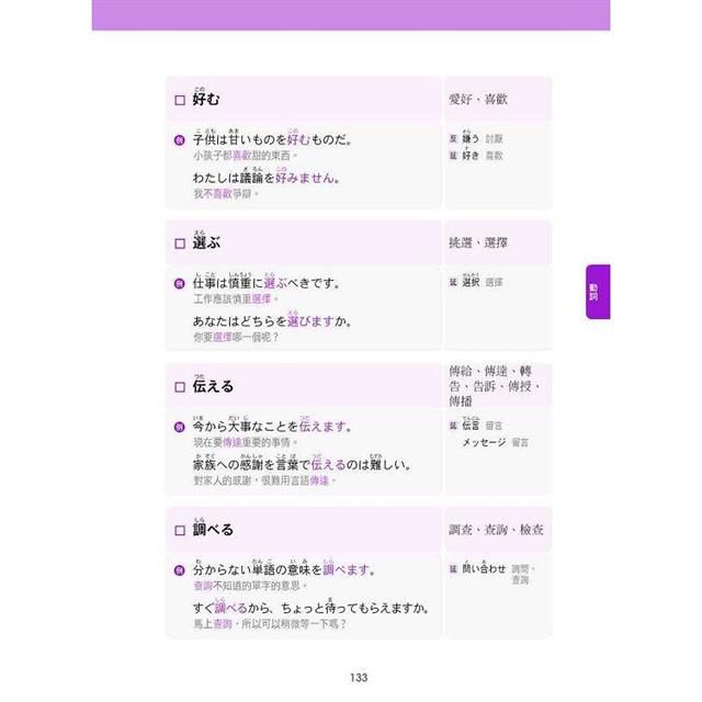 沒有例句的單字書,不僅容易猜錯意思,也無法掌握用法。本書所有單字均提供2句例句,全書共1920個重要例句,且皆以N3的文法來造句,不會有過難或過簡單的問題。每天在記住24個單字的同時,也等於熟悉了48個N3文法,一石二鳥!