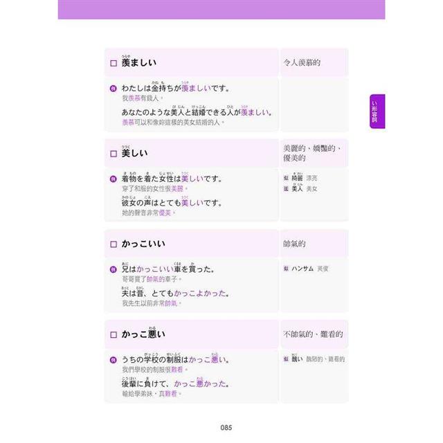 本書羅列日檢N3範圍必考單字,依「名詞」、「い形容詞」、「な形容詞」、「動詞」、「副詞」、「外來語」分類,讓讀者背得有條理!因為日語的詞性與文法變化息息相關,在背誦時,須養成銘記單字詞性的習慣。