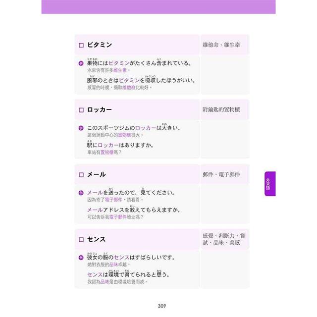 全書所有單字以及例句,均附上日文標音以及中文翻譯,學習零負擔!所有翻譯盡量採取「字對字」的翻譯方式,讓讀者直覺式記憶,盡速熟記所有重點!